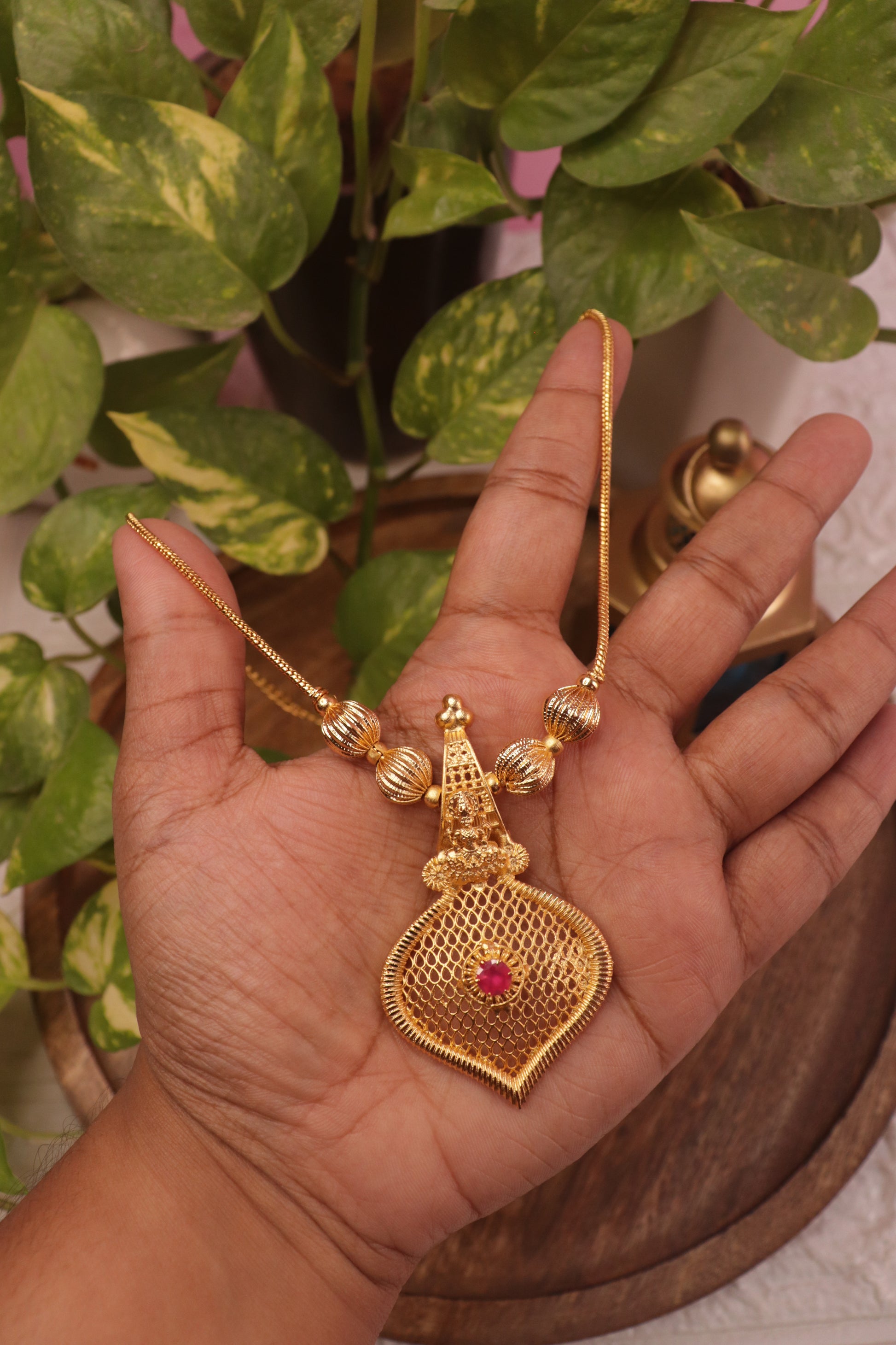 Embrace timeless temple elegance with the Temple Net Design Microplated Dollar Chain, a graceful blend of traditional artistry and refined craftsmanship. This exquisite 18" necklace features a beautifully crafted net-pattern pendant inspired by classic South Indian temple jewellery, highlighted with a striking central red stone that adds a touch of divine charm.