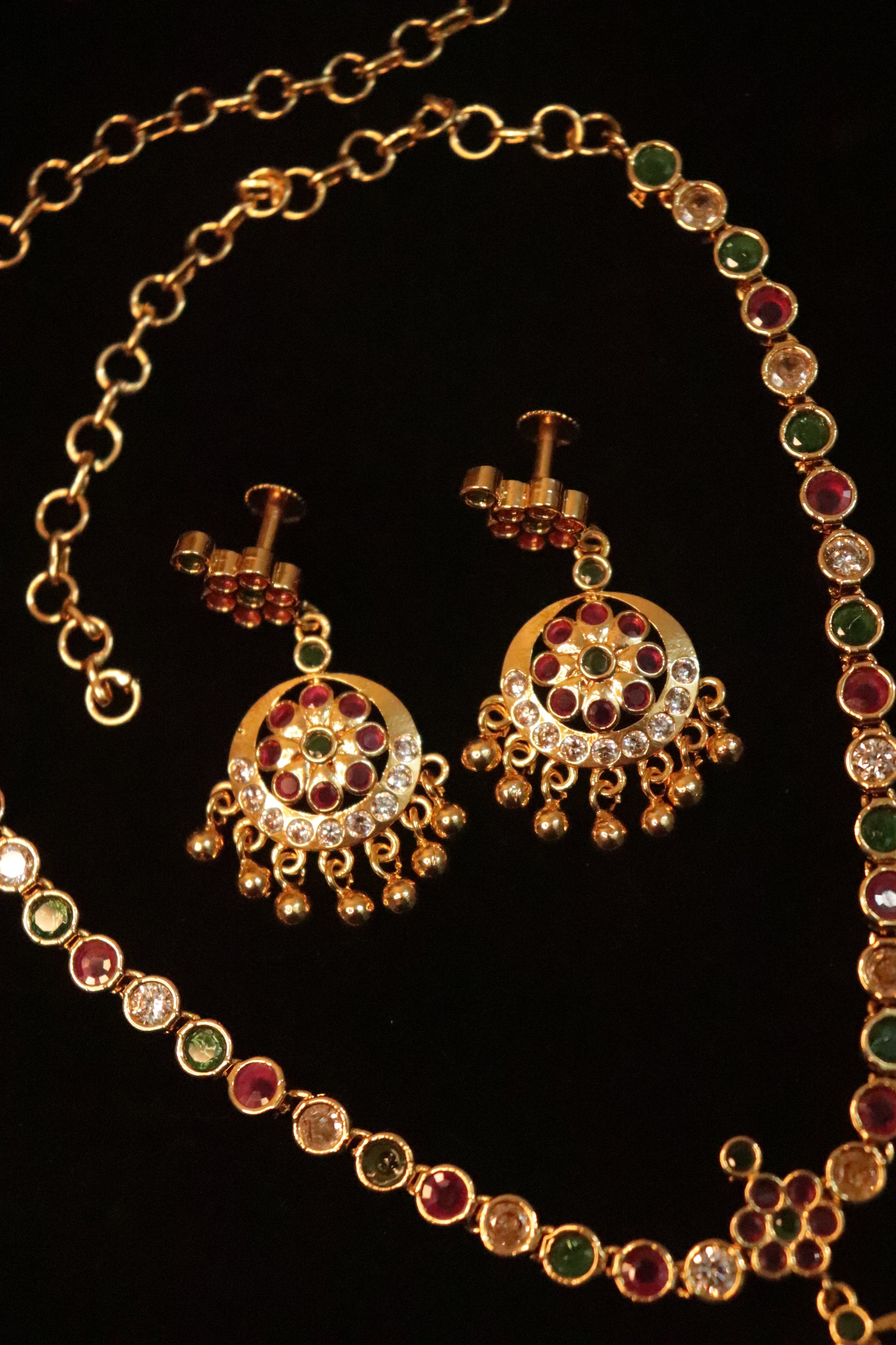 The necklace is adorned with a sequence of delicately set stones that form a vibrant and eye-catching pattern, leading to a beautifully crafted circular pendant with intricate detailing and elegant bead drops. Paired with matching statement earrings that echo the same traditional motif, this set adds a rich heritage charm to your jewellery collection.