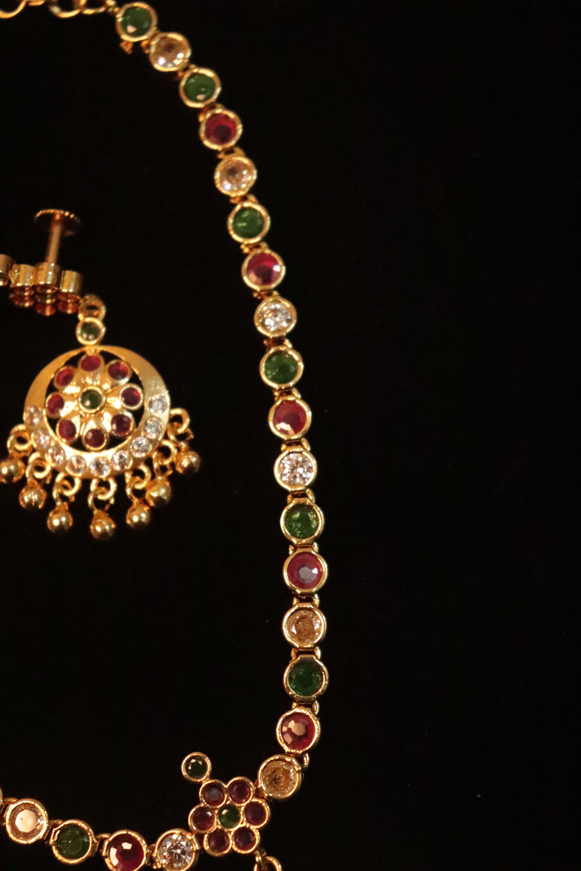 Pendant Detail: Intricately crafted circular pendant enhanced with detailed stone work and elegant bead danglers.